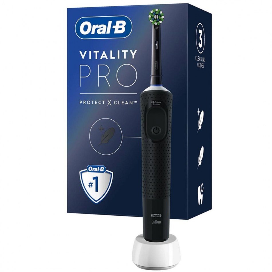 Braun Oral B Vitality Pro Negro (D103.413)Oral-B Vitality Pro Adulto Cepillo dental giratorio NegroEl cepillo de dientes Braun Oral-B Vitality PRO en color negro (modelo D103.413) es una excelente opción para una limpieza dental superior. Este cepillo elimina hasta un 100 % más de placa que un cepillo manual, brindándote una sensación de limpieza profesional en cada uso.Oral-B Vitality Pro. Utilizar con: Adulto, Tipo de cepillo de dientes: Cepillo dental giratorio, Modos del cepillo de dientes: Cuidados diarios, Sensible. Fuente de energía: Batería. Tipo de embalaje: Blister. Número de empuñaduras incluidas: 1 pieza(s), Número de cabezales incluido: 1 pieza(s)Eliminación superior* de la placaEl cabezal redondo de Vitality PRO rodea cada diente para lograr una limpieza más profunda. Comparado con un cepillo de dientes manual, este cepillo elimina hasta un 100 % más de placa, proporcionándote una higiene bucal efectiva y completa.*vs. un cepillo de dientes manualTres modos de cepilladoEl Braun Oral-B Vitality PRO te ofrece tres modos de cepillado para adaptarse a tus necesidades y preferencias. Puedes elegir entre los modos Sensible Plus, Sensible y Limpieza Diaria para obtener una experiencia de cepillado personalizada y eficiente.TemporizadorEste cepillo de dientes cuenta con un temporizador integrado en el mango, que te ayuda a cepillarte durante los dos minutos recomendados por los dentistas. Además, emite una señal cada 30 segundos para recordarte cambiar la zona de cepillado, asegurando una limpieza completa y uniforme en toda tu boca.Batería de larga duraciónEl Braun Oral-B Vitality PRO es un cepillo de dientes recargable que cuenta con una batería de larga duración. Esto significa que puedes disfrutar de varios usos antes de tener que recargarlo, proporcionándote comodidad y conveniencia en tu rutina de cepillado diario.Sustituye el cabezal del cepillo con regularidadPara asegurar una limpieza óptima, se recomienda cambiar el cabezal del cepillo de dientes cada tres meses. Los filamentos de Oral-B se difuminan de verde a amarillo para indicarte cuándo es el momento de reemplazarlo, garantizando que siempre obtengas los mejores resultados en tu higiene oral.Confía en la marca más usada por dentistas en todo el mundo*. Oral-B es la elección preferida de los profesionales de la salud dental, y los cepillos de dientes Oral-B están desarrollados por dentistas, brindándote una calidad y rendimiento excepcionales.Características Oral-B Vitality Pro:Características:Utilizar con: AdultoTipo de cepillo de dientes: Cepillo dental giratorioVelocidad ajustable: SiTemporizador integrado: SiDuración del temporizador: 2 minNúmero de modos de cepillado de dientes: 3Modos del cepillo de dientes: Cuidados diarios, SensibleColor del producto: NegroControl de energía:Fuente de energía: BateríaEmpaquetado:Tipo de embalaje: BlisterContenido del embalaje:Número de empuñaduras incluidas: 1 pieza(s)Número de cabezales incluido: 1 pieza(s)