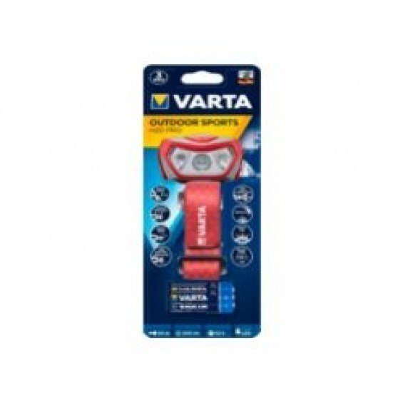 Varta Outdoor Sports H20 Pro. Tipo de flash: Linterna con cinta para cabeza, Color del producto: Gris, Rojo, Material de la carcasa: Acrilonitrilo butadieno estireno (ABS), Policarbonato (PC). Tipo de lámpara: LED, Salida de luz (máx.): 200 lm, Distancia del haz de luz (máx.): 50 m. Tipo de batería: AAA, Tecnología de batería: Alcalino, Autonomía: 52 h. Ancho: 45 mm, Peso: 91,9 g. Cantidad por paquete: 1 pieza(s), Tipo de embalaje: Ampolla