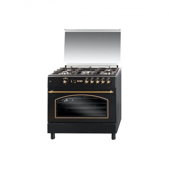 Cocina de 5 fuegos negra de Svan modelo SVK9561FN con gas butano, horno de gas, rustidor de pollos, ignición automática y sistema de seguridad FFD.