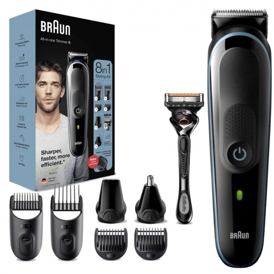 Afeitadora multifunción - Braun Todo En Uno 5 MGK5365, Recortadora De Barba 8 En 1, 6 Accesorios, NegroLa recortadora Braun MGK5365 es una herramienta multifunción que te ofrece la máxima precisión durante su uso. Con 8 funciones en 1, este kit de recortadora de barba te permite recortar cualquier longitud de vello, desde 0,5 hasta 21mm. Puedes recortar el vello de la barba, la cara, la cabeza, la nariz y las orejas.Más afilada, más rápida, más eficienteLa recortadora cuenta con un cabezal de corte más ancho que corta más vello en cada pasada en comparación con los modelos anteriores de Braun. Con esta recortadora, conseguirás tu look deseado con menos pasadas.100% de control de la cabeza a los piesGracias al peine de precisión con un 20% menos de plástico, podrás recortar sin esfuerzo tu bigote, perilla, barba de 3 días o cabello, logrando un recorte preciso en todas las zonas.Diseñadas para durarLa recortadora de barba Braun MGK5365 cuenta con láminas afiladas de larga duración, lo que garantiza un corte de pelo fácil, uniforme y eficiente a cualquier longitud.Avanzada ingeniería alemanaEsta recortadora está equipada con una potente batería de iones de litio que ofrece 100 minutos de autonomía. Además, cuenta con un diseño alemán hecho para durar.Principales ventajas del productoMás afilada. Más rápida. Más eficiente*.Perfilado Braun: un estilo preciso sin esfuerzo.Diseño alemán hecho para durar.Características del productoBarba larga: peine largo para mantener la barba de 13 a 21 mm.Barba corta: peine corto para mantener las barbas de 3 a 11 mm.Recorte preciso: recorta todas las zonas difíciles de la barba y el pelo para conseguir el estilo deseado.Corte de pelo: corta el pelo a la longitud exacta que necesites, de 0,5 a 21 mm, con los dos peines ajustables de doble uso.Características adicionalesPerfilado de contornos y cabezal de perfilado para crear líneas y contornos precisos en cuello y mejillas.Lavable: el cabezal es lavable con agua corriente para facilitar la limpieza.Batería de iones de litio de larga duración: ofrece 100 minutos de autonomía y se recarga completamente en 1 hora o de forma rápida en 5 minutos.Set de estilismo definitivo: realiza 8 funciones con un solo dispositivo.Características técnicasTipo de dispositivo: Afeitadora multifunción.Anchura de Corte: N/A.Longitud mínima de corte: 0.5 mm.Longitud máxima de corte: 21 mm.Número de accesorios del peine: 13.Material de cuchilla: N/A.Funcionamiento en mojado: Sí.Cuchillas lavables: Sí.Indicador de nivel de carga: Sí.Modo de funcionamiento: Adaptador de corriente.Tipo de batería: Lithium Ion.Autonomía: 100 min.Tiempo de carga del fabricante: 1 hora.Recarga rápida: Sí.Potencia máxima: 240 W.Área de aplicación: Cara, Cabeza.Color: Negro.Peso: 0.34 kg.''Consigue el mejor look con la recortadora Braun MGK5365: más afilada, más rápida, más eficiente. ¡Stock disponible en las Islas Canarias!''