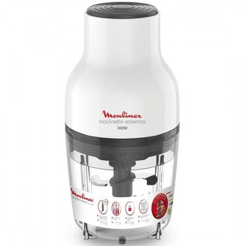 Moulinex Moulinette Essential DJ5201 - Picadora 3 en 1 pica, mezcla y trocea, sistema tapa de presión 300 W, capacidad 0.4 L, para picar todo tipo de ingredientes con 4 cuchilla con tapa removiblesPicadora 3 en 1 capaz de picar, mezclar y trocear con un solo aparato; podrás picar cualquier ingrediente sin esfuerzo, simplemente presionando la tapaGracias a sus 4 cuchillas de alto rendimiento, podrás picar, cortar en trozos pequeños y mezclar rápidamente cualquier tipo de ingrediente: carne cruda, cebolla, ajo, especias, nueces, avellanas, queso, verdurasRecipiente con gran capacidad y te permite procesar hasta 400 ml de alimentosPiezas de la picadora aptas para lavavajillas; las cuchillas de acero inoxidable son desmontables y se pueden lavar en el lavavajillas, para facilitar la limpiezaSistema fácil y sencillo para no preocuparte de complicadas instrucciones y mil programas diferentes, ofrece una velocidad que se adaptará a tus necesidades, sólo tendrás que presionar la tapa y todo listoControl total; gracias a su depósito transparente podrás ver en todo momento cómo queda el picado permitiéndote pararlo cuando lo deseesDimensiones compactas para que puedas almacenarlo donde quieras tengas o no espacio gracias a sus 11.7 x 11.7 x 23.3 centímetrosComponentes incluidos: 1 x Moulinex Moulinette Essential Picadora