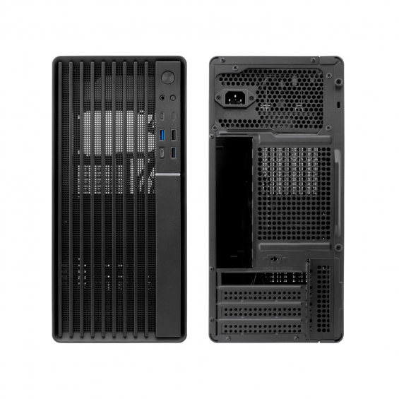 Incluye bahías para discos de 3.5” y 2.5” y dispone de 2 puertos USB 3.2 Gen1 (1 x USB-A / 1x USB-C) y 2 USB 2.0 frontales, con conector combo HD-Audio.