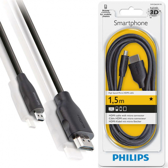 Cable HDMI a micro HDMI SWV2462W/10Experimenta la televisión de alta definiciónIdeal para conectar el teléfono móvil a un HDTV.Cable HDMI™ con microHdmi (yHDMI)1,5 mAlta velocidadMicroconectorMicroconector HDMI (D) para teléfonos móviles y cámaras Conector HDMI de 19 patillas que está diseñado exclusivamente para el uso con teléfonos móviles, cámaras digitales y otros dispositivos portátiles de alta definición.UHD 2160p (4K)Es compatible con resoluciones de vídeo de hasta 4K 2160 píxeles con ultra alta definición. Permite que tu pantalla rivalice con los sistemas de cine digital utilizados en las salas de cine.Experiencia 3DCompatible con todos los formatos de vídeo 3D, lo que permite disfrutar del verdadero cine en casa y de aplicaciones de juegos en 3D.Audio Return Channel (ARC)Permite que un televisor conectado mediante HDMI, con sintonizador integrado, envíe datos de audio digital a un sistema de audio Surround, eliminando la necesidad de disponer otro cable de audio.Conectores niquelados para un contacto más fiableLos conectores niquelados proporcionan un contacto limpio entre el cable y el conector, con lo que se produce una conexión más fiable.Agarre ergonómico y antideslizante para un uso fácilSu agarre antideslizante facilita la conexión de los componentes de forma cómoda y ergonómica.Forro de PVC flexibleEl forro de PVC flexible protege el delicado núcleo del cable. Además, ofrece mayor durabilidad y facilita la instalación.Construcción sin plomo respetuosa con el medio ambienteConstrucción sin plomo con materiales respetuosos con el medio ambiente.Características Philips Cable HDMI SWV2462W/10:Características:Longitud de cable: 1,5 mConector 1: HDMI tipo A (Estándar)Conector 2: HDMI tipo D (Micro)Color del producto: NegroContactos del conector chapado: NíquelGénero del conector: Macho/MachoCantidad por paquete: 1 pieza(s)Peso y dimensiones:Ancho del paquete: 9,5 mmProfundidad del paquete: 3,8 mmAltura del paquete: 23,5 mmTipo de embalaje: BlisterOtras características:Peso tara: 0,186 kgPeso tara: 1,583 kgPeso del paquete: 0,089 kgPeso bruto: 0,422 kgPeso de la caja externa bruta: 2,999 kgAltura (cm): 16,8 cmAltura (cm): 36,1 cmLongitud (cm) cartón interno: 24,1 cmLongitud (cm) cartón externo: 32,1 cmPeso neto: 0,236 kgPeso neto de la caja de cartón exterior: 1,416 kgPeso neto del embalaje: 0,059 kgPeso tara: 0,03 kgCantidad: 4 pieza(s)Cantidad: 24 pieza(s)Anchura (cm): 10,2 cmAnchura (cm): 25,4 cmDatos logísticos:EAN/UPC/GTIN: 87 12581 62256 5Caja GTIN (EAN/UPC): 1 87 12581 62256 2Caja de envío GTIN (EAN/UPC): 2 87 12581 62256 9