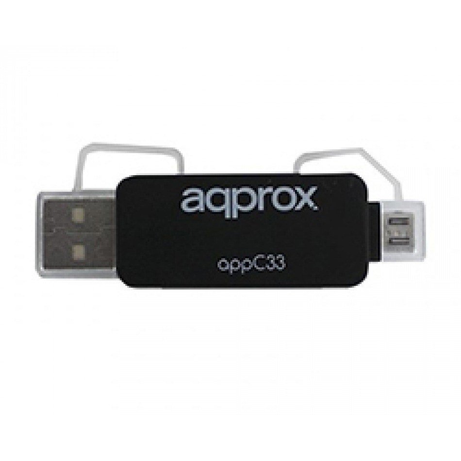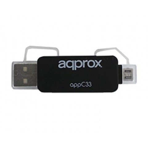 Approx APPC33. Tarjetas de memoria compatibles: MMC, MicroSD (TransFlash), SD, Color del producto: Negro, Tamaño máximo de tarjeta de memoria: 32 GB. Tipo de interfaz: USB 2.0/Micro-USB. Alimentación: USB. Ancho: 62,5 mm, Profundidad: 17,6 mm, Altura: 9,89 mm. Ancho del paquete: 100 mm, Profundidad del paquete: 135 mm, Altura del paquete: 35 mm