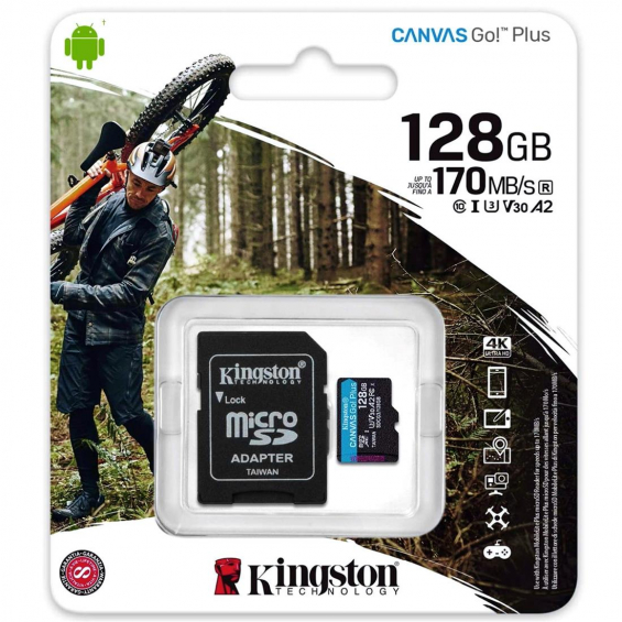 Memoria Micro SDXC 128GB Kingston Go Plus 170R A2 U3 V30 - 740617301182Descripción del productoLa memoria flash Micro SDXC Kingston Go Plus es la opción perfecta para almacenar y transferir tus datos de manera segura y eficiente. Con una capacidad de almacenamiento de 128 GB, esta tarjeta de memoria te brinda espacio suficiente para guardar tus fotos, videos y archivos importantes.EspecificacionesMarca: KingstonModelo: SDCG3/128GBCapacidad: 128 GBTipo de tarjeta flash: MicroSDVelocidad de lectura: 170 MB/sVelocidad de escritura: 90 MB/sTipo de memoria interna: UHS-IClase de velocidad UHS: Class 3 (U3)Clase de velocidad de vídeo: V30Clase de memoria flash: Clase 10Sistemas de archivos soportados: exFATCondiciones ambientalesIntervalo de temperatura operativa: -25 - 85 °CIntervalo de temperatura de almacenaje: -40 - 85 °CPeso y dimensionesAncho: 15 mmProfundidad: 1 mmAltura: 11 mmEmpaquetadoAdaptador de memoria incluido: SDCantidad por paquete: 1 pieza(s)Control de energíaVoltaje de memoria: 3.3 VCaracterísticasColor del producto: NegroFunciones de protección: Resistente a golpes, Resistente a la temperatura, Resistente a las vibraciones, Resistente al agua, A prueba de rayos X