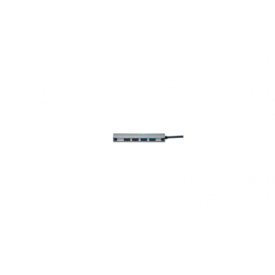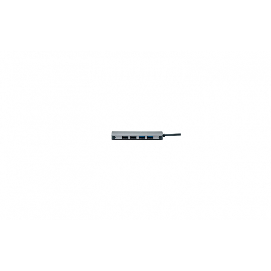 - Pequeña base metálica USB-C que puede conectar hasta dos monitores externos