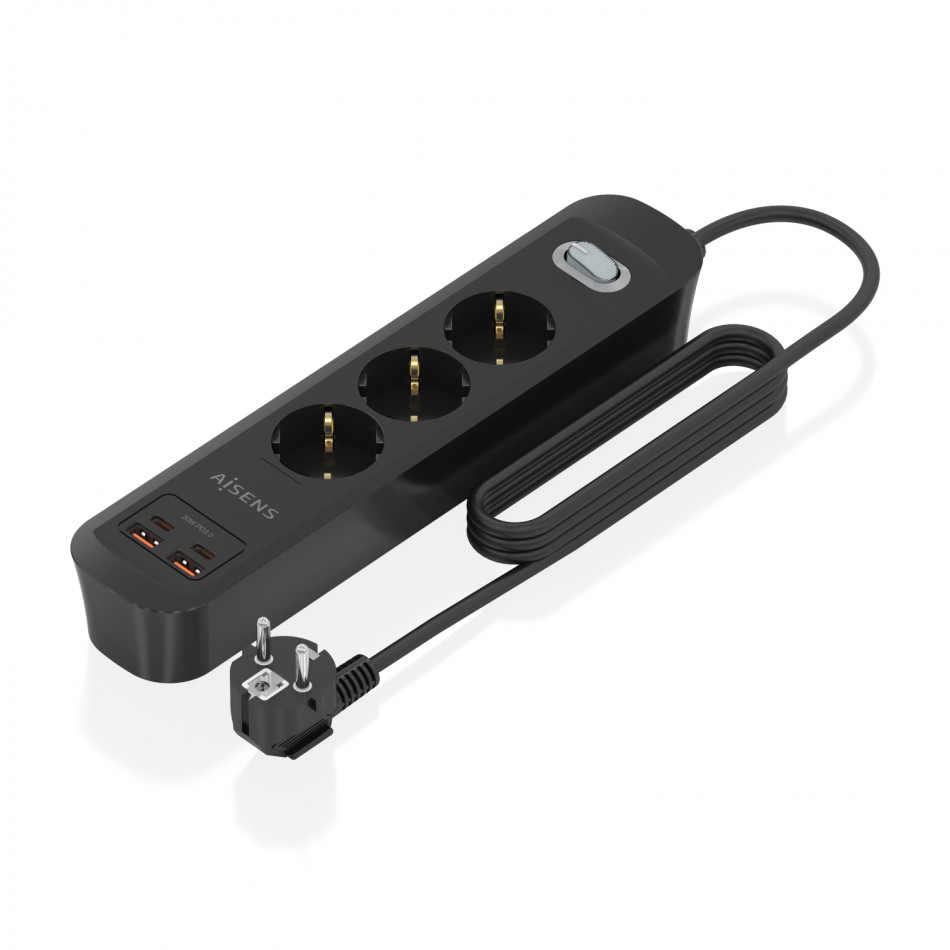 AISENS Regleta de Enchufes Multifuncion con 3 Tomas + Cargador PD3.0 20W 2xUSB-C, 2xUSB-A, 1.4m, Negro