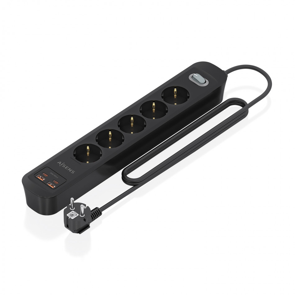 AISENS Regleta de Enchufes Multifuncion con 5 Tomas + Cargador PD3.0 20W 2xUSB-C, 2xUSB-A, 1.4m, Negro