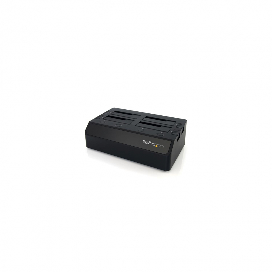 - ESPECIFICACIONES: Base de 4 bahías - SATA III (6Gbps) con TRIM - USB 3.2 Gen 1 (5Gbps) - Ventiladores dobles de 40 mm - Diseño sin herramientas - Bahías intercambiables en caliente - Estilo de carga superior con botones de expulsión - LEDs de actividad