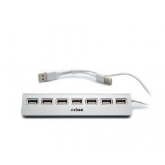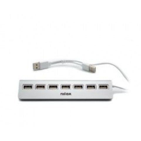 Nilox HUB sobremesa de aluminio con 7 puertos USB 2.0. Interfaz de host: USB 2.0, Interfaces de concentradores: USB 2.0. Velocidad de transferencia de datos: 480 Mbit/s, Color del producto: Gris, Material de la carcasa: Aluminio. Ancho: 21 mm, Profundidad: 36 mm, Altura: 151 mm. Cantidad por paquete: 1 pieza(s)