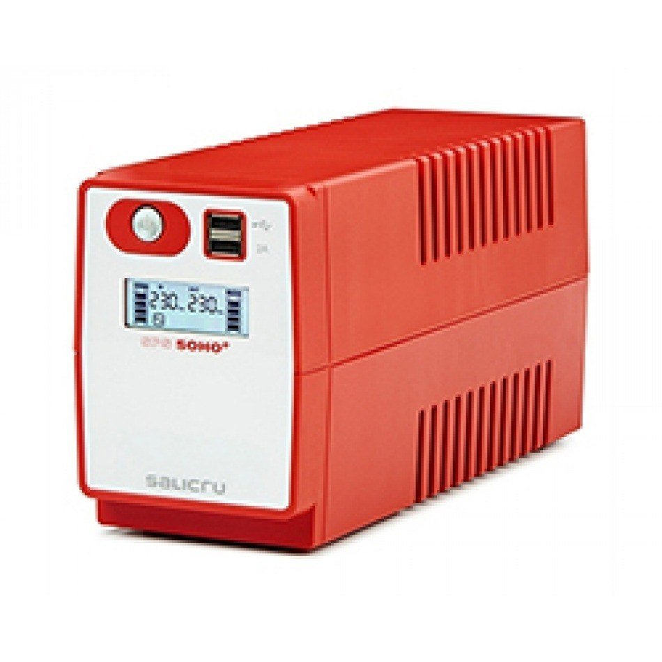 Salicru SPS 500 SOHO+ IEC. Topología UPS: Línea interactiva, Capacidad de potencia de salida (VA): 0,5 kVA, Potencia de salida: 300 W. Tipo de salida AC: C13 acoplador, Conector: C14 acoplador, Cantidad de salidas AC: 4 salidas AC. Tecnología de batería: Plomo-Calcio (Pb-Ca), Tiempo de recarga (90%): 4 h. Factor de forma: Torre, Color del producto: Rojo, Blanco, Tipo de visualizador: LCD. Ancho: 100 mm, Profundidad: 290 mm, Altura: 143 mm