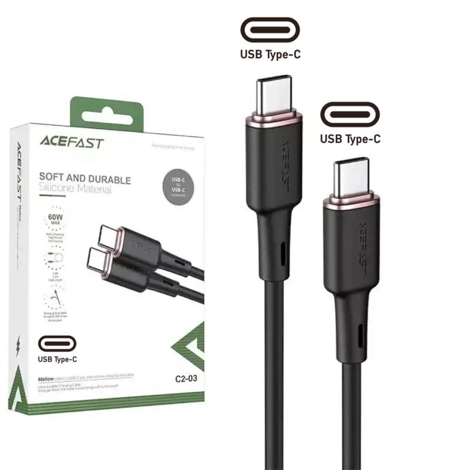 Cable Acefast USB Type-C a USB Type-C 1.2m, 60W (20V/3A) negro (C2-03)El Cable Acefast USB Type-C a USB Type-C es perfecto para cargar y transferir datos. Es compatible con dispositivos que tienen un conector USB Tipo C y está diseñado para brindar una carga rápida en la tecnología Power Delivery.Características principales:Marca: AcefastModelo: C2-03Longitud: 1.2mPeso: 33gColor: NegroTipo de conector: USB Tipo CCarga máxima: 60WCorriente máxima: 3AEstándar USB: 2.0 480MbpsBeneficios:Carga rápida de entrega de energía: Permite una carga rápida en la tecnología Power Delivery.Carga de portátiles: Puede cargar portátiles con un conector USB Tipo C que requieran hasta 60W de potencia.Longitud óptima: El cable tiene una longitud de 1.2m, lo que le permite utilizar cómodamente su dispositivo mientras se carga.No pierdas la oportunidad de obtener el Cable Acefast USB Type-C a USB Type-C, un accesorio confiable y de calidad para tus necesidades de carga y transferencia de datos.¡Obtén el Cable Acefast USB Type-C a USB Type-C ahora mismo y aprovecha el stock disponible en las Islas Canarias!