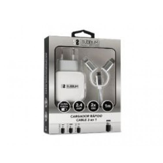SUBBLIM SUB-CHG-1ZWC01. Tipo de cargador: Interior, Alimentación: Corriente alterna, Compatibilidad del cargador: Universal. Voltaje de entrada: 240 V, Voltaje de salida máximo: 5 V. Cantidad de puertos USB 2.0: 2, Carga rápida, Funciones de protección de poder: Sobreintensidad, Sobretensión, Sobrevoltaje, Sobrecarga, Sobrecalentamiento, Sobrecarga. Longitud de cable: 1 m, Color del producto: Plata, Blanco