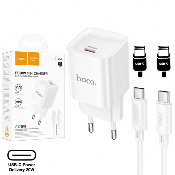 Cargador USB-C 20W + Cable USB-C Hoco C146A PD20W Blanco