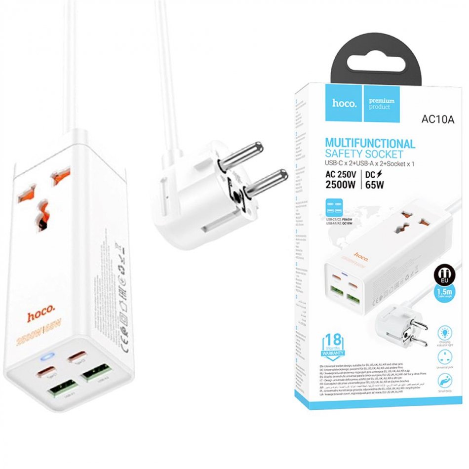 Cargador USB y USB-C 65W entrada Multipaís Hoco AC10A Blanco