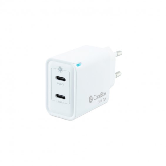 - Cargador rápido USB de pared - 2 Conectores USB-C - Potencia máxima: 35W - Tecnología GaN para una mayor eficiencia y menor calentamiento - Carga rápida a través de USB-C (PowerDelivery) - Indicado para carga de smartphones, tablets, smartwatches? - Compacto y ligero