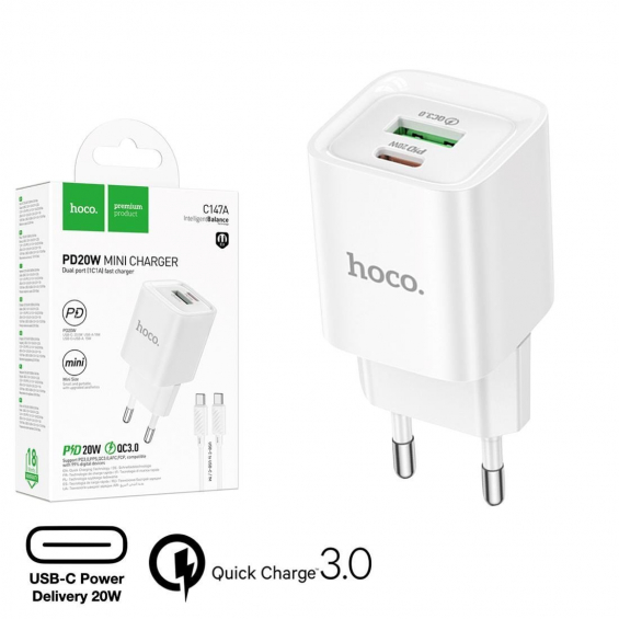 Hoco C147A Cargador USB QC3.0 y USB-C PD 20W Blanco