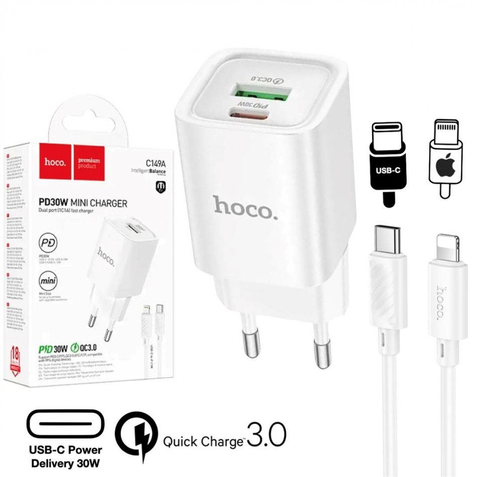 Hoco C149A Cargador Cham PD30W+QC3.0 Type-C to Lightning White