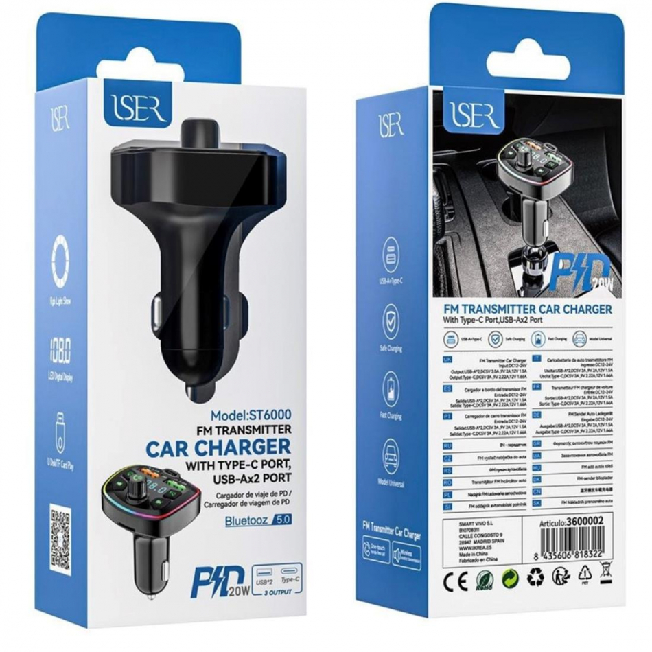 Transmisor FM y Bluetooth para Coche con cargador 20W Iser ST6000