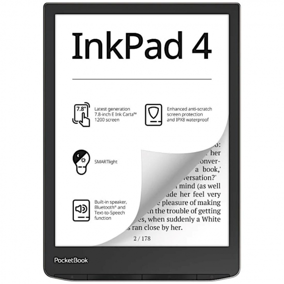 Pocketbook Inkpad 4 7.8'' 32GB Plata (PB743G)El nuevo PocketBook InkPad 4 cuenta con una pantalla de última generación E Ink Carta™ 1200 de 7,8 pulgadas, altavoz integrado, Bluetooth® y resistencia al agua IPX8. Además, mantiene funcionalidades de modelos anteriores como función SMARTlight, compatibilidad con audiolibros y tecnología Text-to-Speech.Diseño compacto y eleganteEl nuevo diseño del PocketBook InkPad 4 es compacto, ergonómico y elegante. Sus discretos marcos de pantalla frontal y trasero en color negro logran un distinguido contraste con los bordes plateados del dispositivo. Además, independientemente de su gran pantalla, solo pesa 265 gramos, por lo que resulta muy cómodo para la lectura en cualquier situación.Características destacadasPantalla E Ink Carta™ 1200: El PocketBook InkPad 4 cuenta con una pantalla de 7,8 pulgadas E Ink Carta™ 1200 de nueva generación, con una resolución de 1404 × 1872 y 300 PPI. Con esta nueva tecnología, la página electrónica tiene un 15% más de contraste y el tiempo de respuesta ha mejorado en un impresionante 20%. El nuevo e-reader también destaca por un tamaño de pantalla muy parecido al de un libro en formato impreso estándar.SMARTlight: Gracias a la función SMARTlight, el PocketBook InkPad 4 permite disfrutar de la lectura independientemente de la iluminación ambiental. La luz frontal adaptativa permite ajustar no solo el brillo de la pantalla, sino también la temperatura del color mediante la selección de un tono cálido o un tono frío. La luz suave de la SMARTlight permite leer de forma cómoda, incluso en condiciones de total oscuridad, protegiendo nuestra vista.Altavoz integrado y tecnología Text-to-Speech: El PocketBook InkPad 4 es compatible con 6 formatos de audio y está equipado con un altavoz integrado.Cabe destacar de forma especial la tecnología Text-to-Speech, que convierte al e-reader en un narrador muy práctico. Con solo 2 clics, puede leer cualquier archivo de texto con una voz natural en uno de los 26 idiomas disponibles.Resistencia al agua IPX8 y protección contra arañazos mejoradas: El PocketBook InkPad 4 está protegido de forma fiable contra los efectos nocivos del agua conforme a la norma IPX8.¡Descubre el PocketBook InkPad 4 y disfruta de la mejor lectura en las Islas Canarias! ¡Stock disponible ahora!