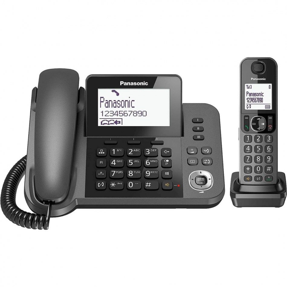 Panasonic KX-TGF310EXM Teléfono 2 en 1 NegroTeléfono digital inalámbrico y con cableEl Panasonic KX-TGF310EXM es un teléfono versátil que te ofrece la comodidad de un auricular inalámbrico y la funcionalidad de un auricular con cable. Con este teléfono, podrás disfrutar de todas las características esenciales que necesitas para mantenerte conectado de manera eficiente.Pantalla LCD 1.8'' y diseño compacto y eleganteEste teléfono cuenta con una pantalla LCD de 1.8 pulgadas que te permite visualizar claramente la información de las llamadas entrantes y salientes. Además, su diseño compacto y elegante se ajusta perfectamente a espacios estrechos y su pantalla orientable de gran tamaño resulta muy útil.Modo ECO con un toque y batería de larga duraciónCon el modo ECO con un toque, podrás ahorrar batería y consumo de luz, lo que te permite utilizar el teléfono de manera eficiente y responsable. Además, su batería de 17 horas de uso continuo y 300 horas en espera garantiza una excelente duración de la batería para que nunca te quedes desconectado.Bloqueo de llamadas no deseadas y agenda de 100 nombres y númerosCon la función de bloqueo de llamadas no deseadas, podrás dejar de recibir llamadas indeseadas y mantener tu privacidad. Además, su agenda de 100 nombres y números te permite tener todos tus contactos importantes siempre a mano.Teclas de marcación directa y funcionamiento durante un corte de suministro eléctricoEl Panasonic KX-TGF310EXM cuenta con 3 teclas de marcación directa para que puedas llamar rápidamente a los números que más utilizas. Además, en caso de un corte de suministro eléctrico, el teléfono seguirá funcionando gracias a su batería de respaldo, lo que te permite realizar llamadas incluso en situaciones de emergencia.Funciones adicionalesAuricular inalámbrico y con cableGran pantalla inclinable fácil de consultarBotón específico para el bloqueo de llamadas en la unidad baseFunciona durante un corte de suministro eléctricoModo No molestarSin radiaciones (Modo Eco Plus)Teléfono manos libres dúplex completo con auricular inalámbricoDECT Security para proteger las llamadasEl Panasonic KX-TGF310EXM es el teléfono perfecto para aquellos que buscan funcionalidad, comodidad y seguridad en un solo dispositivo. ¡No esperes más y adquiere el tuyo ahora mismo!¡El Panasonic KX-TGF310EXM es el teléfono ideal para ti en las Islas Canarias! Con su diseño compacto y elegante, pantalla LCD de 1.8'' y funcionalidades versátiles, este teléfono te mantendrá conectado de manera eficiente. Además, cuenta con funciones adicionales como el bloqueo de llamadas no deseadas y una agenda de 100 nombres y números. ¡No te quedes sin el tuyo y adquiérelo ahora mismo para disfrutar de funcionalidad, comodidad y seguridad en un solo dispositivo!