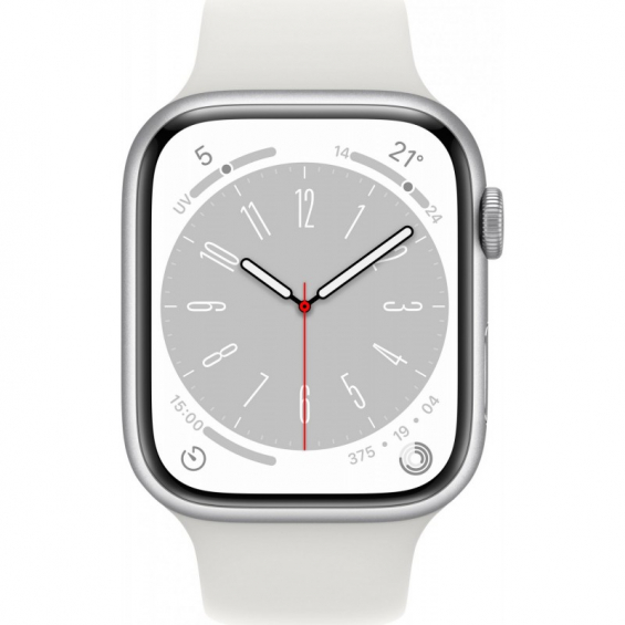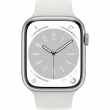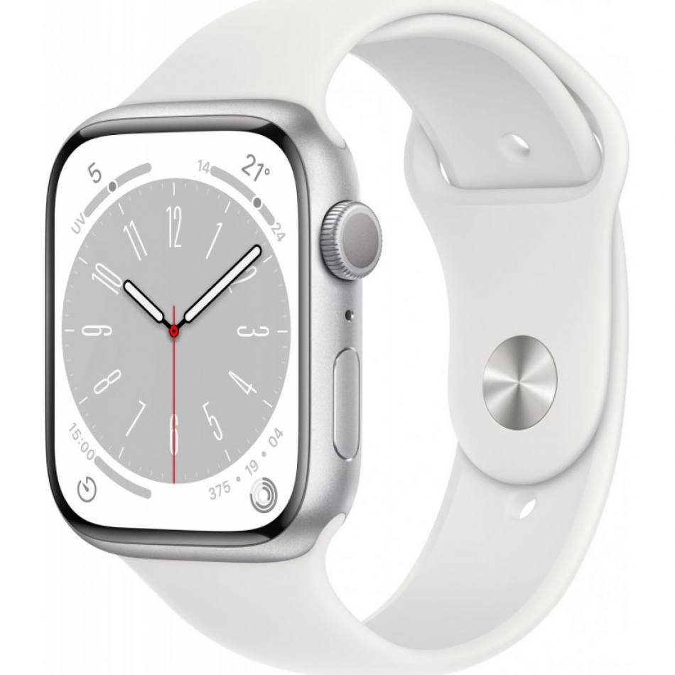 Apple Watch Series 8 con caja de aluminio plata de 41mm y correa deportiva blanca, con GPS incorporado.