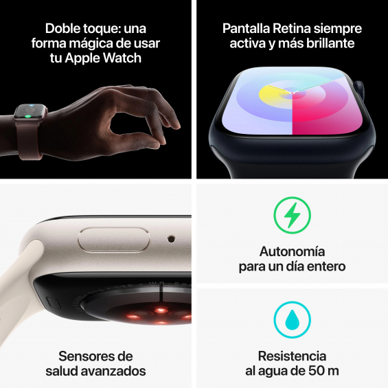 Con capacidades de conectividad celular 4G LTE, el Apple Watch Series 9 te mantiene conectado en cualquier lugar. Su autonomía de batería de hasta 36 horas asegura que podrás disfrutar de sus funciones durante todo el día.